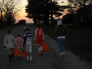 The kids had fun trick-or-treating, and it was a pretty nice evening. We walked through the town as a big group, going from house to house. It brought back memories of when Pat and I used to walk through our town trick-or-treating thirty-some years ago. Here we were as adults, trick-or-treating together with our children! 🙂