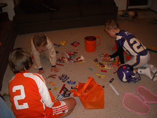 We went back to their home for chili and all the fixins. The kids emptied their candy on the floor and did what Pat and I used to do…trade our candy. It brings a smile to my face as I think about how we used to do that. 🙂