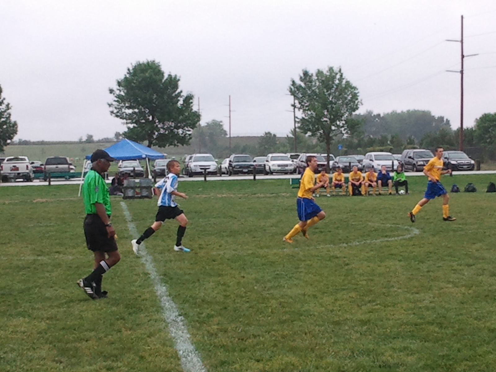 Our team played very well together for their first time out. It was a 6v6 tournament. They played three games…won 1, lost 1, tied 1. I tried to take a few pictures from my phone, as I was holding the umbrella and the player cards all at the same time. I didn’t want to chance getting my camera wet, so the pictures below are as good as they got for today. 🙂 You can see how wet everything was…and even how the rain was pouring down on us!