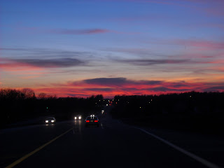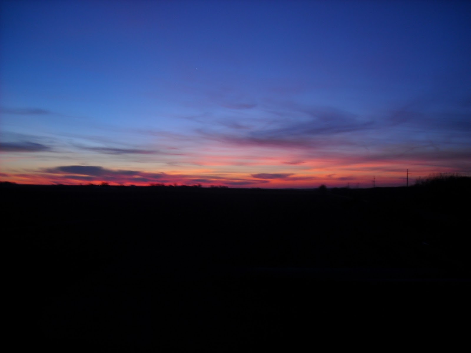 Today I was very thankful for the sunset we saw as we were almost home driving back from our Thanksgiving trip to Wisconsin Dells.  It was breath-taking!  The more I watched it, the more colors seemed to emerge.  I grabbed my camera and took a couple of pictures through the windshield of our vehichle, which by no means show the beauty of what we saw.  Bill commented, “It’s too bad they don’t last longer (meaning sunsets).”  I agreed with him.  Even Ali and Zach in the back seat commented on how beautiful it was.  We drove in silence for awhile as we watched.