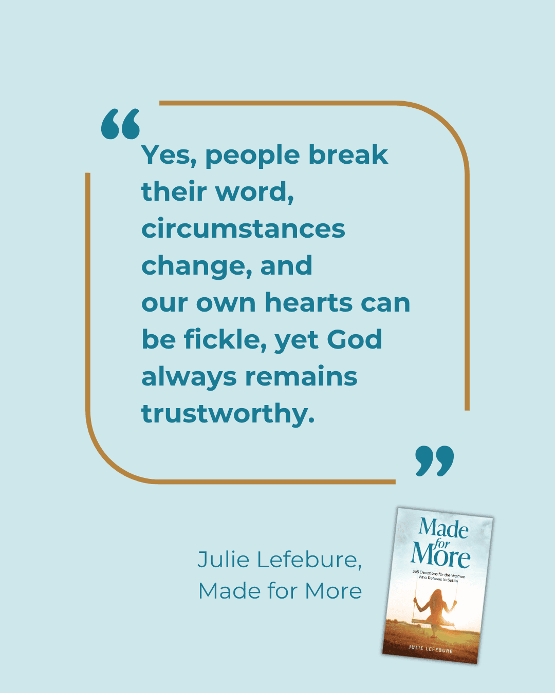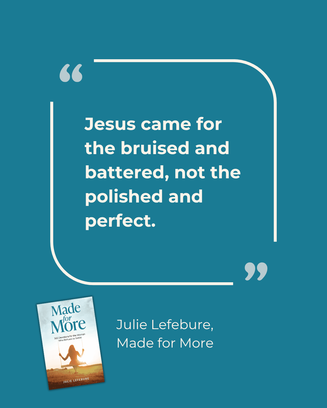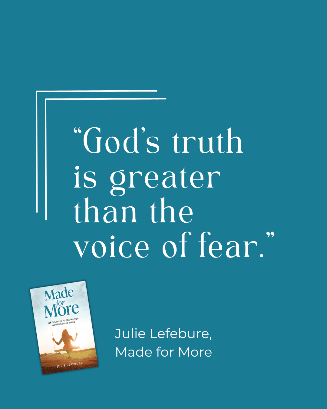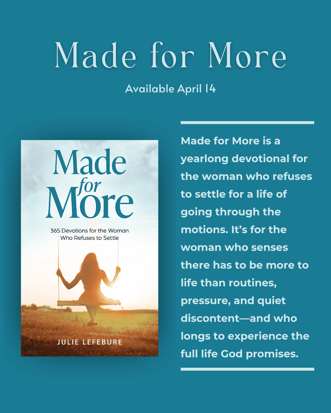 Made for More is a yearlong devotional for the woman who refuses to settle for a life of going through the motions. It’s for the woman who senses there has to be more to life than routines, pressure, and quiet discontent—and who longs to experience the full life God promises.