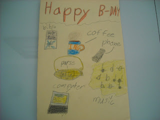 Bennett’s card for me…he drew a Bible, an ING coffee mug, a cell phone, musical notes, my mustard-colored purse, and my laptop…all of my favorite things!