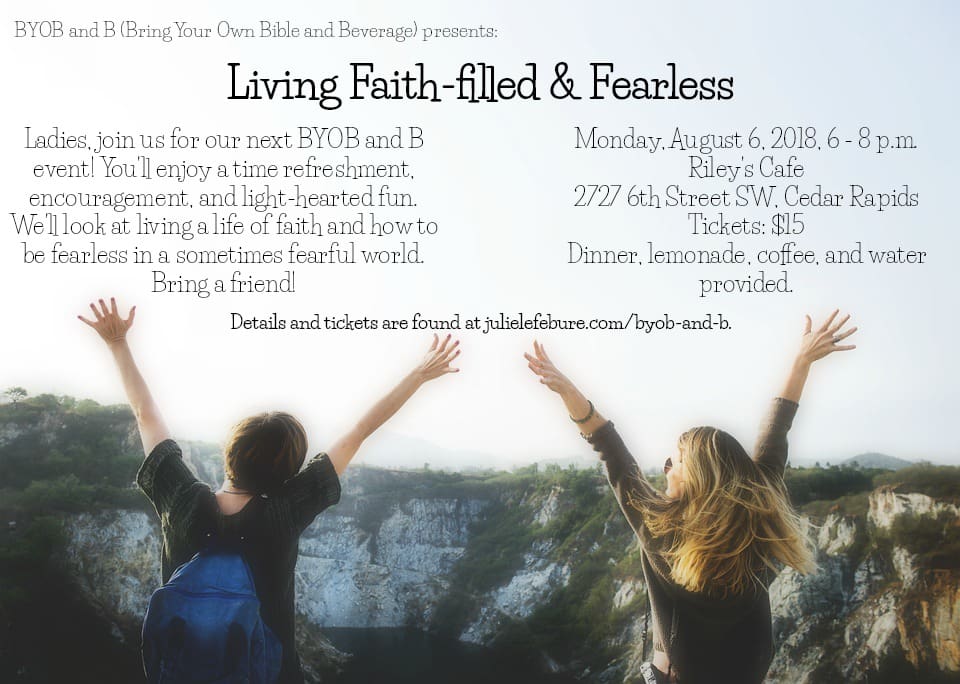 Join us for our next BYOB and B (Bring Your Own Bible and Beverage) event! It’ll be a powerful evening of encouragement as we look at Living Faith-filled and Fearless on Monday, August 6 from 6-8 p.m. in Cedar Rapids. All the details can be found here: