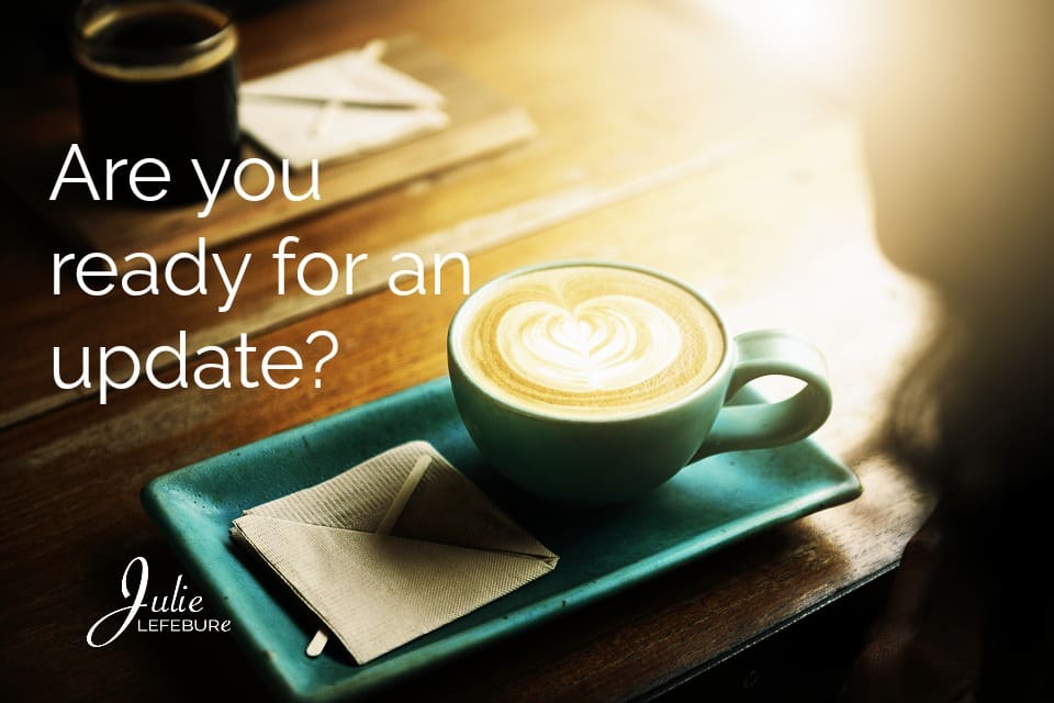I like updates. Well, for the most part. I don’t care much for the latest Snapchat update, though. I was just getting the hang of the last one. Speaking of updates, you may have noticed something different here at julielefebure.com. A fresh new look. Bright and calming hues with a special flair. Less distractions. And, a fun, refreshing tone. My friends at Fistbump Media helped me create this brand new image. I like it a lot (imagine me saying that in Lloyd Christmas’ tone on Dumb and Dumber because that’s how much I like it)! Friend, I hope you do too!