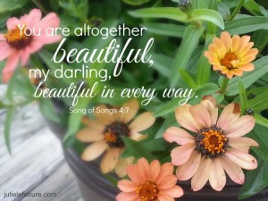 God also created us physically unique. You may be blonde. I’m a brunette (with a few highlights). We have different facial features. Our eyes might be a different color. Our bodies are similar, yet are shaped different. I’ll be the first to admit that the part of my body that I like the least is the very part I notice first on other women. I truly have to fight–almost daily–against comparing.